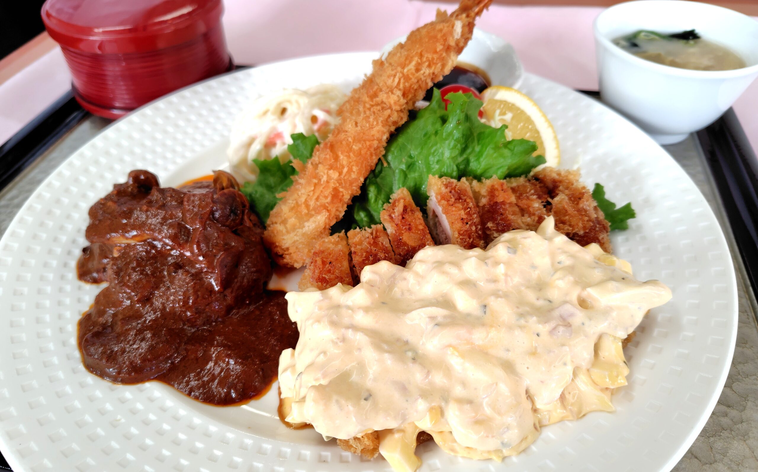 ハンバーグ・エビフライ・チキン南蛮は自家製タルタルソースをたっぷりとかけております。